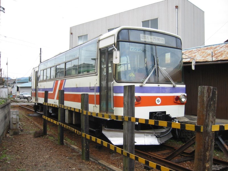 .jpg) | 場所:西御坊駅 こちらは時々見かける「キテツ1形」と呼ばれるラッピング車です。 ココまでくるとほとんど「バス」ですねw まぁ、ベースがバスなんで当たり前かww コノ車両は「冷暖完備」! |